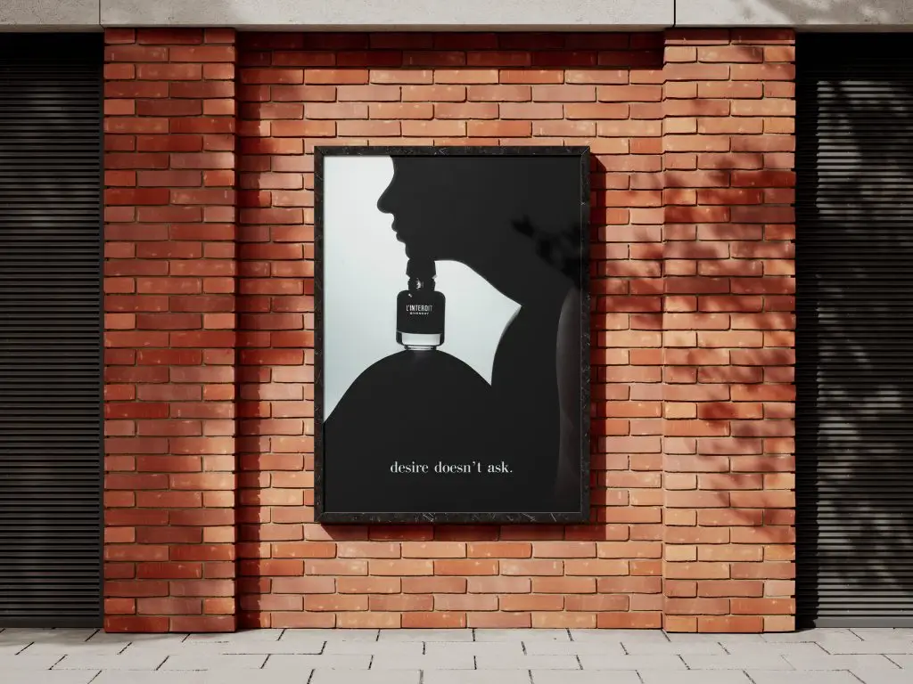L’Interdit translates to “the forbidden,” a word that immediately implies boundaries, restraint, and temptation. We approached the campaign as an exploration of what happens when those boundaries are crossed. The line “you crossed it” refers not to a physical action, but to a psychological moment, the instant when hesitation dissolves into decision. The silhouetted figures introduce ambiguity and secrecy, removing clear identity and replacing it with suggestion. By obscuring faces and details, the visuals create a private space where desire feels hidden, personal, and unspoken, allowing the viewer to step into the moment of crossing without being fully seen.